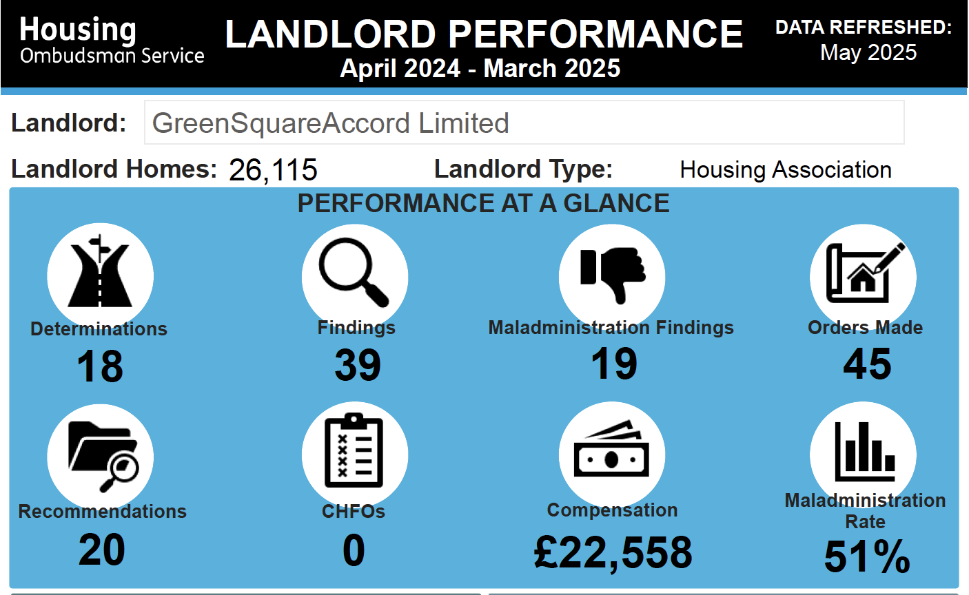 GreenSquareAccord example: In 2024/25, they were found to have committed severe maladministration in 5% of cases, including cases relating to damp and mould and heating failures.